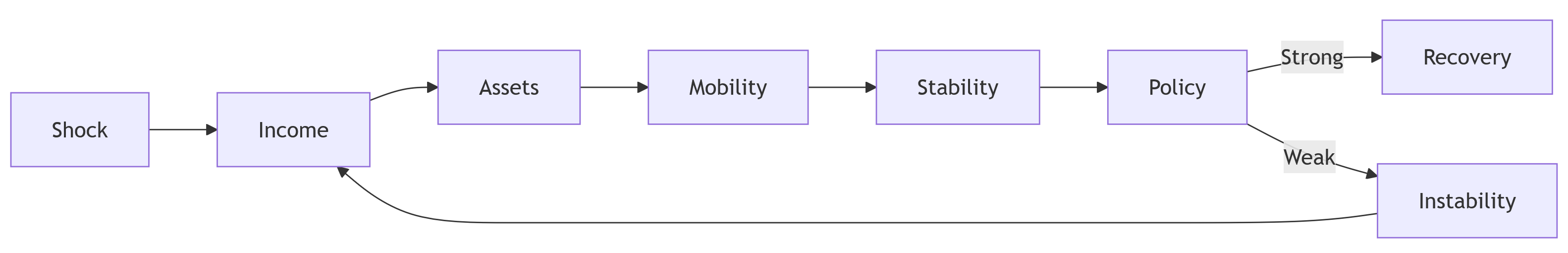 Walk through diagram slowly. Shock occurs Income drops Assets deplete Mobility shrinks Instability rises Then highlight feedback loop: Weak institutional response -> instability -> further income loss. Ask: "Where in this chain is intervention most effective?" Push deeper: Prevention vs correction? Is income support sufficient without asset rebuilding? Does mobility depend on housing affordability? Key phrase: "Institutional design determines whether shocks are dampened or amplified."